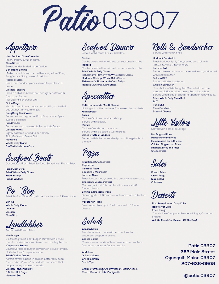 Introducing the menu at Patio 03907, nestled in the charming Ogunquit, ME, this hidden gem is perfect for seafood lovers and families alike. Customers rave about the delectable lobster pizza, rich lobster mac-n-cheese, and the classic lobster roll, ideal for sharing. Beyond the seafood offerings, the clam chowder stands out with its smoky bacon notes, while the Bang Bang Cauliflower and fried pickles add a delightful twist to the experience.